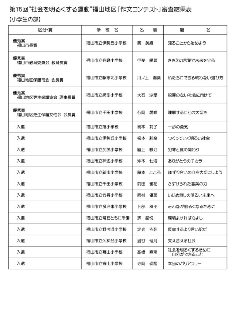 【'25/10/07更新】2025年度 第75回”社会を明るくする運動”福山地区 作文コンテスト結果
