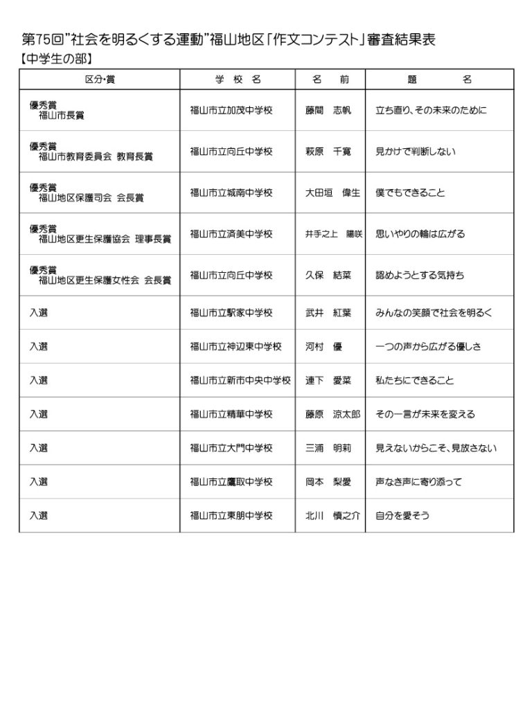 2021年度 第71回”社会を明るくする運動”福山地区 作文コンテスト結果